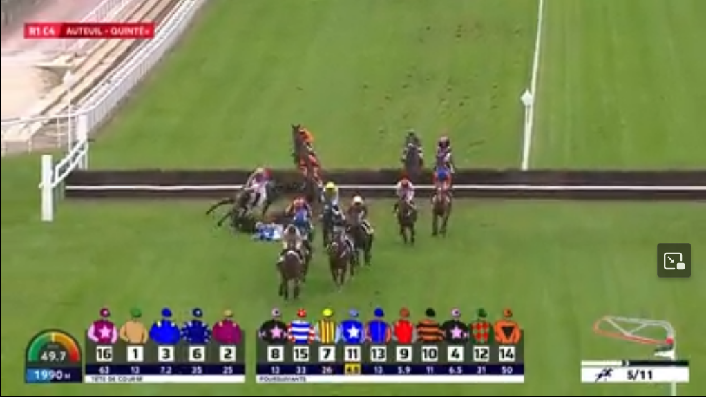 Décidément quand çà ne veut pas… çà ne veut pas… PARFUM D’UNE REINE était bien en course quand elle est tombée suite à la chute de KRISTAL DU SEUIL donc les 2 premiers chevaux de ma sélection par terre alors qu’il restait presque 2km a faire… NEXT