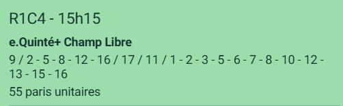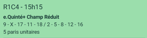 Mon Quinté en champ libre : 9-X-17-11-X avec pour le 1er X : 2-5-8-12-16 et pour le second X en supplément (je mets en gras pour ZAZ) 1-3-6-7-10-13-15-18 à noter qu’on ne peut pas valider ce ticket sur pmu.fr j’ai un message d’erreur avec indiqué qu’on ne peut sélectionner que 20 chevaux.